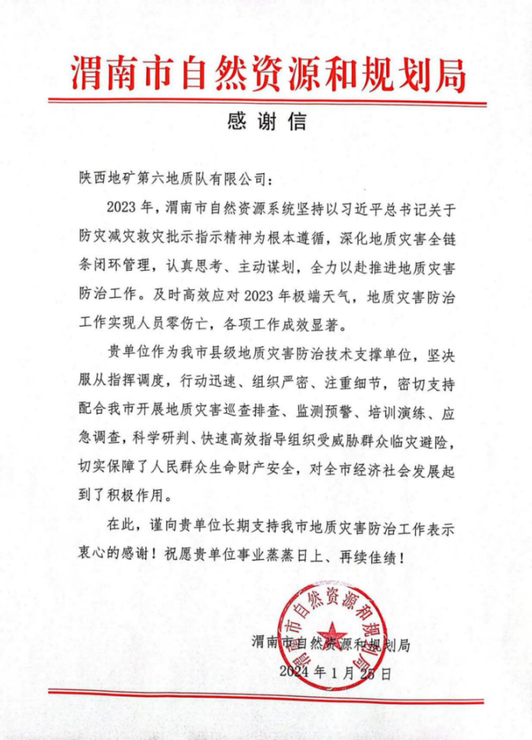 2024年1月26日,渭南市自然資源和規(guī)劃局向我公司發(fā)來感謝信,對陜西地礦第六地質(zhì)隊有限公司為渭南市地質(zhì)災(zāi)害防治工作做出的貢獻(xiàn)和辛勤付出表示衷心的感謝。